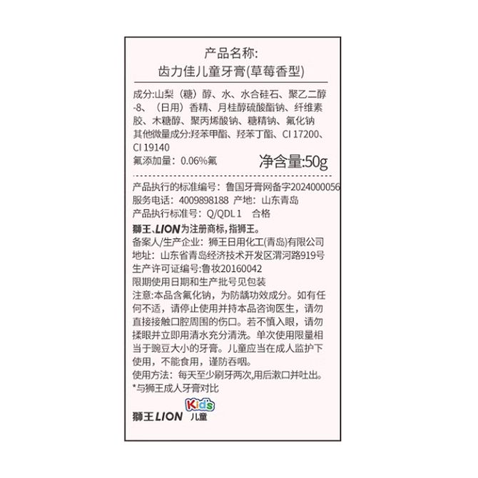 狮王(Lion) 齿力佳儿童科学防蛀牙膏2-12岁(草莓) 50g 含氟防蛀|牙龈护理|清洁抑菌 兑换价格 2200 里程 会员卡别 终身白金卡 白金卡 金卡 银卡 普通卡 儿童卡 服务 由 潮美妆 发货并提供售后 化妆品容量: 50g/ml 购买数量: 件 库存件 配送地址: 立即购买 加入购物车 成功添加到购物车 关闭 购物车共有 种商品 总金额为: 组合销售 产品介绍 产品规格 售后服务 产品咨询 发现好货 云南白药牙膏单支清新口气呵护牙龈健康牙周冬青 活性肽165g 1500 里程 云南白药 健齿护龈改善牙龈问题清新口气留兰香型180g 1500 里程 云南白药牙膏留兰香型180g 去黄牙垢口气清新减轻牙龈问题 1500 里程 云南白药 牙膏(薄荷清爽)230g 单支装 清新口气健齿护龈 经典清爽薄荷香型牙膏 1支装 1600 里程 舒客专效防蛀氟素牙膏(清新薄荷)140g*3防蛀固齿呵护口腔清新口气 1100 里程