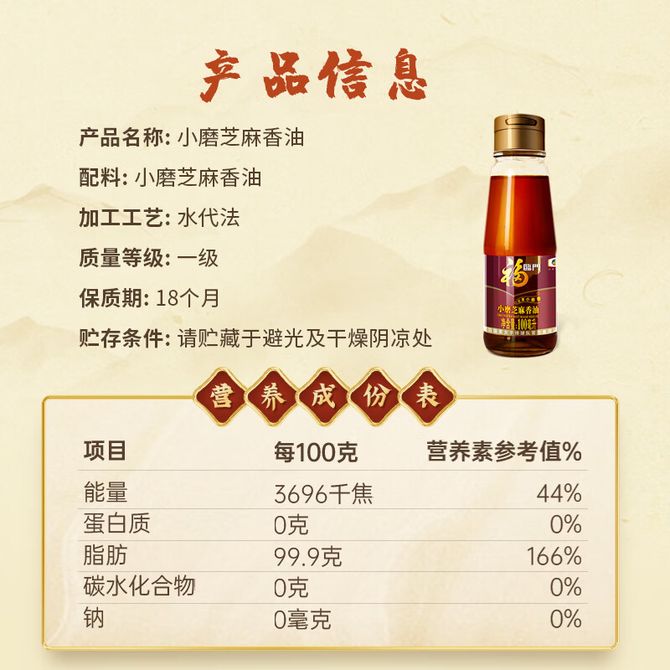 福临门 小磨香油 凉拌调味烹饪油 家用芝麻油 100ml 小磨真功夫 醇香好滋味 甄选艺麻 小磨工艺 滴滴醇香 兑换价格 1100 里程 会员卡别 终身白金卡 白金卡 金卡 银卡 普通卡 儿童卡 服务 由 深圳房易通科技有限公司 发货并提供售后 油品规格: 100ml 购买数量: 件 库存件 配送地址: 立即购买 加入购物车 成功添加到购物车 关闭 购物车共有 种商品 总金额为: 组合销售 产品介绍 产品规格 售后服务 产品咨询 发现好货 长寿花 金胚玉米油食用油非转基因压榨一级 1.8L 2200 里程 珍佰粮菜籽油5L 5500 里程 福临门 一级大豆油900ML/瓶 优质家用食用油 1100 里程 福临门 家香味食用油 沂蒙土榨 花生仁油900ml 1600 里程 金龙鱼 浓香花生油5L 大桶装物理压榨一级厨房烹饪炒菜植物油粮油家庭食用油 浓香花生油食用油 5000 里程