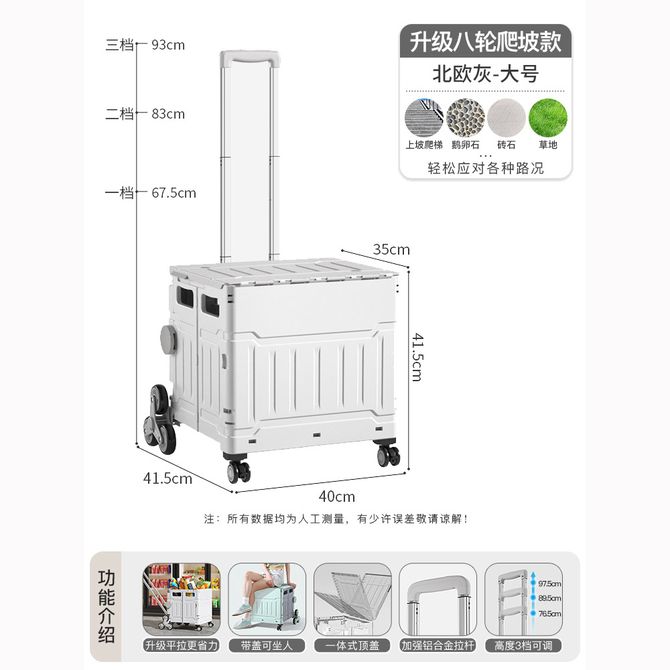 友耐/Younal 家用便携多功能收纳箱拉车 家用收纳箱可变小手拉杆车 8轮爬楼款 拉货拖车折叠购物车 家用收纳箱可变小手拉杆车 8轮爬楼款 兑换价格 5700 里程 会员卡别 终身白金卡 白金卡 金卡 银卡 普通卡 儿童卡 服务 由 檀文家居生活旗舰店 发货并提供售后 颜色: 黑色 灰色 浅绿色 购买数量: 件 库存件 配送地址: 立即购买 加入购物车 成功添加到购物车 关闭 购物车共有 种商品 总金额为: 组合销售 产品介绍 产品规格 售后服务 产品咨询 发现好货 佳帮手 60L大号收纳箱整理箱S01-HN60 1300 里程 美国pack all 男士洗漱包 大容量分隔收纳洗护用品收纳包手提式商务运动洗漱用品收纳包 黑色 1800 里程 蕉趣/BANANA TRIP 旅行收纳袋套装 衣物整理收纳包鞋子内衣收纳束口袋 4件套 3900 里程 百露(BELO) 20斤装密封米桶 家用储米箱带轮 大米面粉储物箱 米缸盒厨房防潮防虫 3000 里程 美国pack all折叠式便携行李车家用折叠拖车小推车拉货买菜购物车手拉车拉杆车旅行出差行李车承重30KG黑色 5700 里程