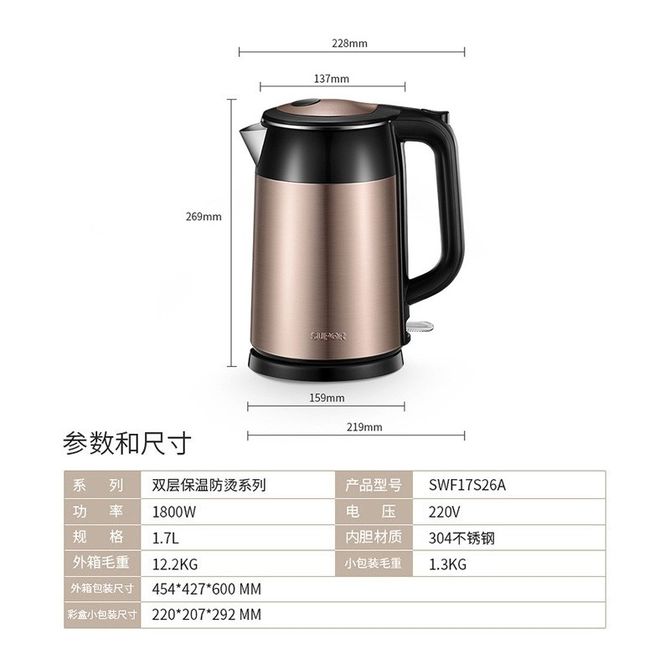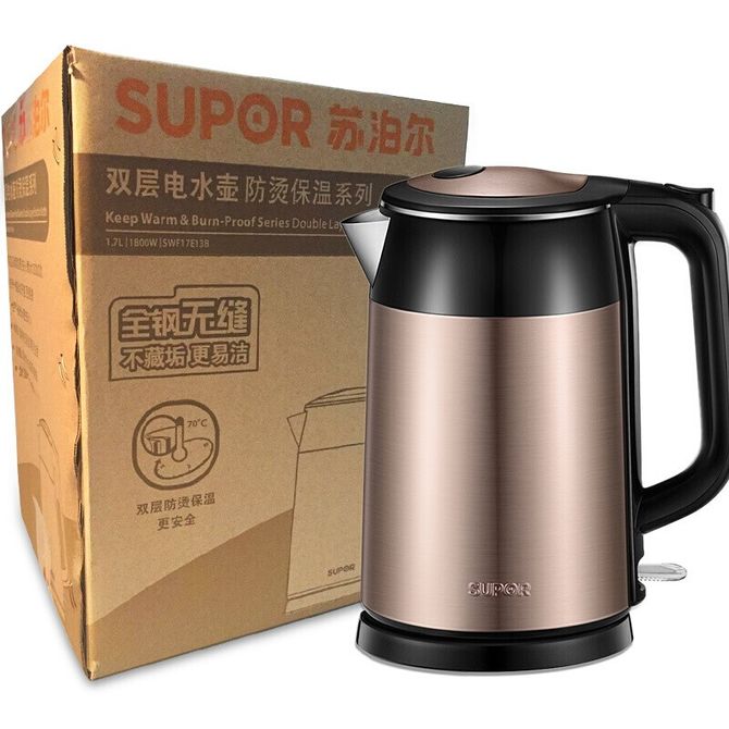 苏泊尔(SUPOR) 双层保温电水壶 SWF17S26A 1.7L 双层防烫 304不锈钢材质 兑换价格 10000 里程 会员卡别 终身白金卡 白金卡 金卡 银卡 普通卡 儿童卡 服务 由 苏泊尔生活电器专卖店 发货并提供售后 颜色: 摩卡棕 购买数量: 件 库存件 配送地址: 立即购买 加入购物车 成功添加到购物车 关闭 购物车共有 种商品 总金额为: 组合销售 产品介绍 产品规格 售后服务 产品咨询 发现好货 苏泊尔(SUPOR)电水壶 1.7L 不锈钢/YL SW-17S13A 5700 里程 志高/Chigo 电水壶烧水壶1.8L大容量电热水壶双层防烫自动断电家用烧水开水壶不锈钢 电水壶 DC-A18F 1900 里程 美的/Midea 电热水壶家用大容量烧水壶热水壶双层防烫电水壶304不锈钢内胆自动断电分离式拔盖 MK-SH15X1-102 3000 里程 小熊/Bear 电水壶家用烧水壶 不锈钢自动断电恒温热水壶保温一体电热水壶1.5L容量 3500 里程 小熊/Bear 烧水壶电水壶热水壶电热水壶开水壶304不锈钢内胆双层防烫1.5L大容量ZDH-Q15U8 3000 里程