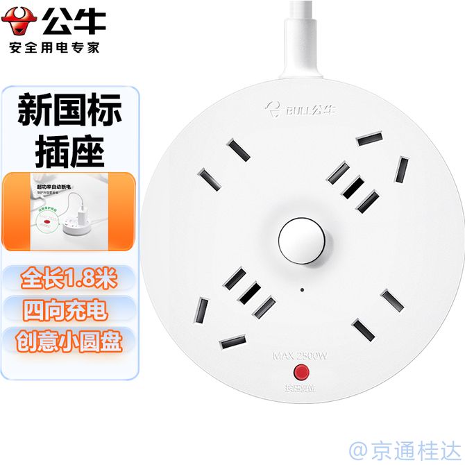 公牛(BULL) 插座插线板插排 排插 拖线板圆形插座4插位总控1.8米长 1.8米,4插位,圆盘新国标插排,创意圆盘四向充电, 过载保护按钮 兑换价格 2100 里程 会员卡别 终身白金卡 白金卡 金卡 银卡 普通卡 儿童卡 服务 由 广西自贸区京通桂达科技发展有限公司 发货并提供售后 插排线: 有线 插位: 4插位 购买数量: 件 库存件 配送地址: 立即购买 加入购物车 成功添加到购物车 关闭 购物车共有 种商品 总金额为: