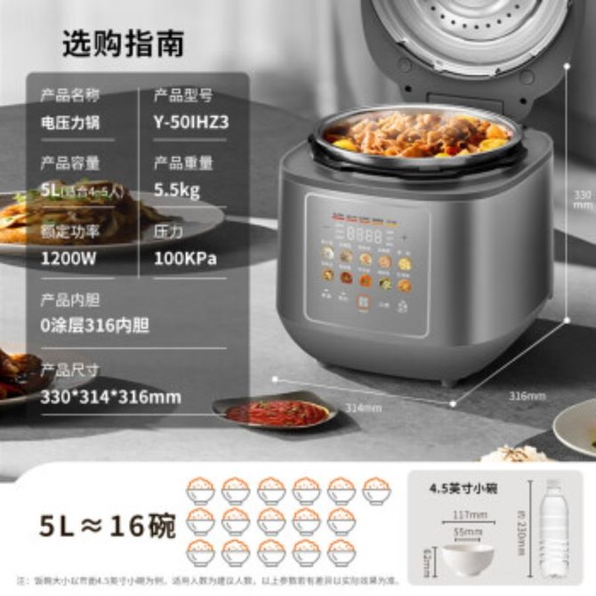 九阳/Joyoung 电压力锅Y-50IHZ3 智能家用5升一锅双胆多功能百千帕免排汽压力煲0涂层316L内胆IH大火加热煮高压锅 智能家用5升一锅双胆多功能百千帕免排汽压力煲0涂层316L内胆IH大火加热煮高压锅 兑换价格 26100 里程 会员卡别 终身白金卡 白金卡 金卡 银卡 普通卡 儿童卡 服务 由 纳华优选 发货并提供售后 颜色: 灰色 购买数量: 件 库存件 配送地址: 立即购买 加入购物车 成功添加到购物车 关闭 购物车共有 种商品 总金额为: 组合销售 产品介绍 产品规格 售后服务 产品咨询 发现好货 苏泊尔(SUPOR)电压力锅 6升大容量 智能触控 球釜双胆 开盖收汁 一键排压 SY-60YC8001Q 高压锅 16900 里程 美的/Midea 电压力锅家用5L大容量多功能高压锅双胆一键收汁智能预约不粘电高压锅电饭锅煮粥煲汤锅 一锅双胆【一键收汁入味】 YL50M1-702 10600 里程 苏泊尔(SUPOR) 5L电压力锅家用电高压锅双胆高压电饭锅煮饭智能预约 SY-50YC8186 11300 里程 美的/Midea 电压力锅 【一锅双胆】5L全自动家用智能预约 上蒸下煮 不粘双胆煲汤炖肉 YL50Q3-451 10900 里程 美的/Midea 电压力锅 高压锅家用电压力煲智能预约电饭煲大容量多功能定时预约电饭煲3-8人单胆旋钮款4L MY-E4809 8700 里程