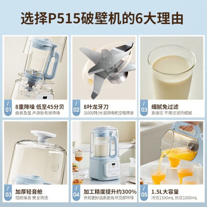 九阳/Joyoung 破壁机1.5L L15-P515 隔音罩降噪智能预约高速破壁一机多能榨汁机豆浆机 兑换价格 26100 里程 会员卡别 终身白金卡 白金卡 金卡 银卡 普通卡 儿童卡 服务 由 存悦商贸 发货并提供售后 颜色: 天蓝色 购买数量: 件 库存件 配送地址: 立即购买 加入购物车 成功添加到购物车 关闭 购物车共有 种商品 总金额为: 组合销售 产品介绍 产品规格 售后服务 产品咨询 发现好货 WIFER 豆浆机大容量破壁机料理机全自动榨汁机免滤304钢1200ML 3500 里程 WIFER 豆浆机全自动静音大容量多功能免煮免过滤辅食榨汁破壁机316钢不锈钢豆浆机米色豆浆机1.2L 4400 里程 九阳 Joyoung 破壁免洗豆浆机0.4-1.5L超大容量 智能熬煮多功能 轻松预约DJ15E-K350 52200 里程 小熊/Bear 豆浆机1-2人家用免过滤免煮五谷杂粮多功能破壁机豆浆机小型迷你榨汁机高温一键清洗 米白色 DJJ-H05C1 6700 里程 摩 动/modong 豆浆机家用破壁机 全自动免煮辅食料理榨汁机 多功能小型预约保温 白色 1.2L -MD-DJ29 7400 里程