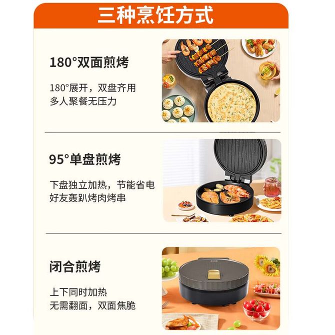 组合销售 产品介绍 产品规格 售后服务 产品咨询 发现好货 苏泊尔(SUPOR)电饼铛家用 双面加热煎饼铛煎烤机三明治机烙饼锅早餐机25mm加深烤盘火力可调JD31A847A 6500 里程 苏泊尔(SUPOR) 电饼铛 自动煎烤机 电火锅多功能 加大加深60mm双加热烙饼 锅面煎饼电饼档 两档火力 JT30A818 5700 里程 苏泊尔(SUPOR)电饼铛家用双面加热电饼档煎烤机烙饼机双面悬浮加热早餐机三明治机JJ30A648-Q 5700 里程 美的(Midea)电饼铛家用智能双面加热煎烤机烙饼机蛋饼机薄饼机煎饼烙饼锅JHN30F 4800 里程 奥克斯 电饼铛家庭用新款双面加热加大尺寸加深烤盘烙饼专用锅自动控温断电煎饼锅早餐机 5200 里程