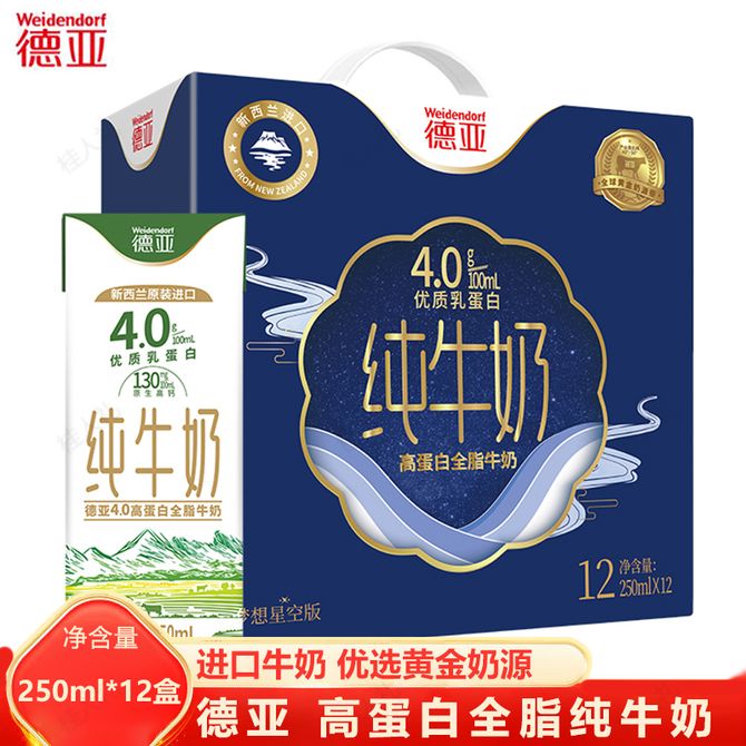 德亚 4.0g 新西兰进口高蛋白全脂纯牛奶250ml*12(梦想星空版)优质牛奶学生老人营养早餐奶 礼盒装 天然优质牧场 新西兰黄金奶源 兑换价格 3300 里程 会员卡别 终身白金卡 白金卡 金卡 银卡 普通卡 儿童卡 服务 由 广西桂人礼互联网科技有限公司 发货并提供售后 规格: 礼盒 购买数量: 件 库存件 配送地址: 立即购买 加入购物车 成功添加到购物车 关闭 购物车共有 种商品 总金额为: 组合销售 产品介绍 产品规格 售后服务 产品咨询 发现好货 蒙牛 特仑苏纯牛奶苗条装250ml×12盒 2900 里程 三元 经典小方白全脂纯牛奶250ml*24盒牛奶 整箱 3400 里程 伊利金典纯牛奶250ml*12盒整箱 2200 里程 伊利 金典纯牛奶整箱 250ml*12盒 3.6g乳蛋白 原生高钙 礼盒装 1800 里程 特仑苏 新日期纯牛奶250ml*12盒 3.6g乳蛋白 礼盒装 京东/顺丰发货 2400 里程