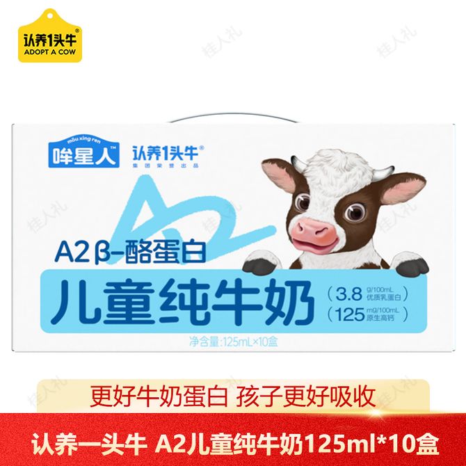 认养一头牛 柳叶哞星人A2儿童纯牛奶125ml*10盒 升级3.8g蛋白 优质A2β酪蛋白易吸收 营养儿童奶 单提装 A2β-酪蛋白儿童纯牛奶 兑换价格 1600 里程 会员卡别 终身白金卡 白金卡 金卡 银卡 普通卡 儿童卡 服务 由 广西桂人礼互联网科技有限公司 发货并提供售后 规格: 礼盒 购买数量: 件 库存件 配送地址: 立即购买 加入购物车 成功添加到购物车 关闭 购物车共有 种商品 总金额为: 组合销售 产品介绍 产品规格 售后服务 产品咨询 发现好货 蒙牛 特仑苏纯牛奶苗条装250ml×12盒 2900 里程 三元 经典小方白全脂纯牛奶250ml*24盒牛奶 整箱 3400 里程 伊利金典纯牛奶250ml*12盒整箱 2200 里程 伊利 金典纯牛奶整箱 250ml*12盒 3.6g乳蛋白 原生高钙 礼盒装 1800 里程 特仑苏 新日期纯牛奶250ml*12盒 3.6g乳蛋白 礼盒装 京东/顺丰发货 2400 里程