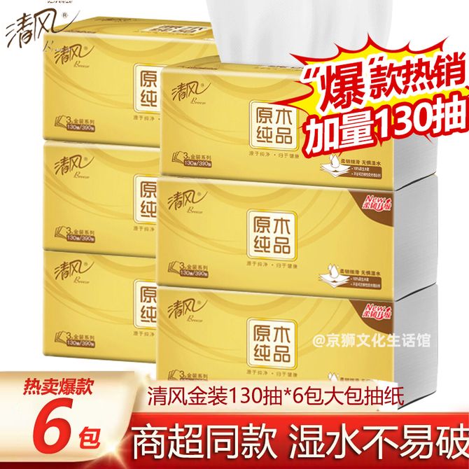 清风 金装3层130抽*6包抽纸 原生木浆 紧致厚实湿水可用面巾纸餐巾纸软抽纸巾卫生纸家庭用纸 该款为清风原木金装3层130抽6包餐巾纸,详情图片共用。 兑换价格 1100 里程 会员卡别 终身白金卡 白金卡 金卡 银卡 普通卡 儿童卡 服务 由 京狮文化生活馆 发货并提供售后 包装数量: 1提 购买数量: 件 库存件 配送地址: 立即购买 加入购物车 成功添加到购物车 关闭 购物车共有 种商品 总金额为: 组合销售 产品介绍 产品规格 售后服务 产品咨询 发现好货 维达卷纸 卫生纸实惠装厕纸家用厕所纸巾手纸整箱批有芯大卷家庭装 1200-2300 里程 维达 Vinda 卷纸 140g/卷*10卷 蓝色经典3层卫生纸 1300 里程 心相印抽纸 茶语丝享系列 量贩家庭装 3层*100抽*4包(茶香 压花) 1100 里程 心相印 经典系列 二层面巾纸 180抽*6包*1提 1100 里程 维达Vinda 超韧系列抽纸(3层*130抽*6包) 原生木浆卫生餐巾纸婴儿面巾纸 6包优惠装 1100 里程