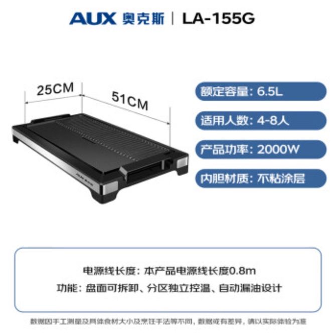 奥克斯/AUX 电烤盘LA-155G 家用烤肉锅 电烧烤炉烤肉专锅电烤炉不粘烤肉机全身可拆洗电烧烤锅 家用烤肉锅 电烧烤炉烤肉专锅电烤炉不粘烤肉机全身可拆洗电烧烤锅 兑换价格 9600 里程 会员卡别 终身白金卡 白金卡 金卡 银卡 普通卡 儿童卡 服务 由 纳华优选 发货并提供售后 颜色: 黑色 购买数量: 件 库存件 配送地址: 立即购买 加入购物车 成功添加到购物车 关闭 购物车共有 种商品 总金额为: 组合销售 产品介绍 产品规格 售后服务 产品咨询 发现好货 苏泊尔(SUPOR)电饼铛家用 双面加热煎饼铛煎烤机三明治机烙饼锅早餐机25mm加深烤盘火力可调JD31A847A 6500 里程 苏泊尔(SUPOR) 电饼铛 自动煎烤机 电火锅多功能 加大加深60mm双加热烙饼 锅面煎饼电饼档 两档火力 JT30A818 5700 里程 苏泊尔(SUPOR)电饼铛家用双面加热电饼档煎烤机烙饼机双面悬浮加热早餐机三明治机JJ30A648-Q 5700 里程 美的(Midea)电饼铛家用智能双面加热煎烤机烙饼机蛋饼机薄饼机煎饼烙饼锅JHN30F 4800 里程 奥克斯 电饼铛家庭用新款双面加热加大尺寸加深烤盘烙饼专用锅自动控温断电煎饼锅早餐机 5200 里程