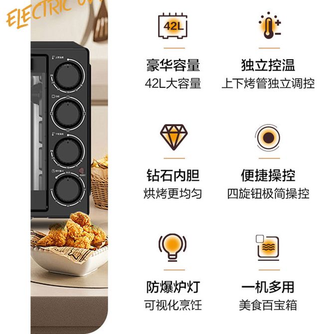 格兰仕/Galanz 电烤箱42升超大容量畅享烘焙食光上下独立控温复古高颜值烤箱 (新旧款随机发货)钻石内胆设计 旋钮操控 独立调控 多面散热孔 防爆炉灯可视化烹饪 兑换价格 16100 里程 会员卡别 终身白金卡 白金卡 金卡 银卡 普通卡 儿童卡 服务 由 北京致诚博雅贸易有限公司 发货并提供售后 颜色: 其他 购买数量: 件 库存件 配送地址: 立即购买 加入购物车 成功添加到购物车 关闭 购物车共有 种商品 总金额为: 组合销售 产品介绍 产品规格 售后服务 产品咨询 发现好货 美的/Midea 空气炸锅 5L可视窗口免翻面电炸锅 双旋钮控时控温 食品接触不粘涂层 MF-KZE5089 8700 里程 荣事达5.5L大容量 家用智能触控多功能空气炸锅 RS-AF181L 10900 里程 美的/Midea 空气炸锅家用新款一体多功能免翻面电炸锅电烤箱华凌烹饪机KZE4501TQ 6500 里程 美的/Midea 空气炸锅 5L家用大容量 可视窗口 免翻面 蒸汽嫩炸 金属内腔 多功能智能精准控温 电炸锅KZC5089 5L 10700 里程 美的/Midea 空气炸锅 免翻面可视家用大容量 5L 多功能 不沾易洗 蒸汽嫩炸 9600 里程