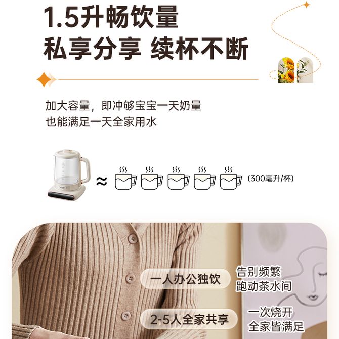 组合销售 产品介绍 产品规格 售后服务 产品咨询 发现好货 九阳/Joyoung 养生壶1.5L茶具电茶壶煮茶壶花茶壶玻璃煮茶器煎药壶中药锅药膳电水壶烧水壶 3900 里程 九阳/Joyoung 养生壶迷你玻璃花茶壶煮茶器 12大功能11档温度 电水壶热水壶烧水壶 1.5L DGD1506BQ 3900 里程 美的/Midea 养生壶 1.5L家用多功能小型全自动办公室烧水壶加厚玻璃煮茶热水壶 MK-YS15P201 4200 里程 美的/Midea 养生壶 1.5L家用养生壶全自动玻璃烧水壶24h预约烧水壶12小时防干烧保护智能恒温 MK-YS15P202 3700 里程 美的/Midea 养生壶 1.5L全自动电热水壶 24h预约12小时智能恒温 14大功能11档控温 花茶壶煮茶器MK-Y12Q 3500 里程