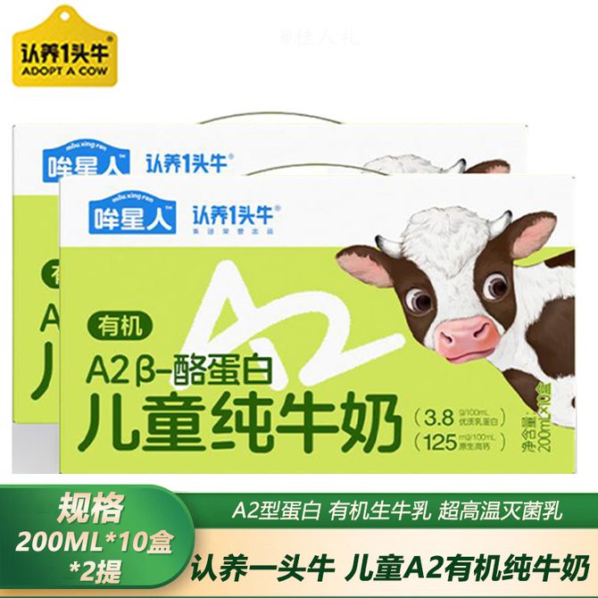 认养一头牛 哞星人A2β-酪蛋白儿童有机纯牛奶200ml*10盒*2箱 优质奶源 营养健康牛奶 礼盒装 新旧包装随机发货 兑换价格 4400 里程 会员卡别 终身白金卡 白金卡 金卡 银卡 普通卡 儿童卡 商品已下架 1. 请联系卖家咨询 2. 逛逛广西桂人礼互联网科技有限公司选择其他商品 组合销售 产品介绍 产品规格 售后服务 产品咨询 发现好货 蒙牛 特仑苏纯牛奶苗条装250ml×12盒 2900 里程 三元 经典小方白全脂纯牛奶250ml*24盒牛奶 整箱 3400 里程 伊利金典纯牛奶250ml*12盒整箱 2200 里程 伊利 金典纯牛奶整箱 250ml*12盒 3.6g乳蛋白 原生高钙 礼盒装 1800 里程 特仑苏 新日期纯牛奶250ml*12盒 3.6g乳蛋白 礼盒装 京东/顺丰发货 2400 里程