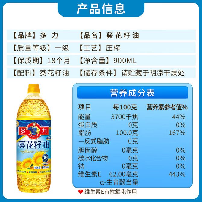 多力/Mighty 油烟少富含维生素E葵花籽油900ml 家用辅食租房小桶尝鲜装 兑换价格 1100 里程 会员卡别 终身白金卡 白金卡 金卡 银卡 普通卡 儿童卡 服务 由 罗迪诺食品专营店 发货并提供售后 油品规格: 900ml 购买数量: 件 库存件 配送地址: 立即购买 加入购物车 成功添加到购物车 关闭 购物车共有 种商品 总金额为: 组合销售 产品介绍 产品规格 售后服务 产品咨询 发现好货 长寿花 金胚玉米油食用油非转基因压榨一级 1.8L 2200 里程 珍佰粮菜籽油5L 5500 里程 福临门 一级大豆油900ML/瓶 优质家用食用油 1100 里程 福临门 家香味食用油 沂蒙土榨 花生仁油900ml 1600 里程 金龙鱼 浓香花生油5L 大桶装物理压榨一级厨房烹饪炒菜植物油粮油家庭食用油 浓香花生油食用油 5000 里程