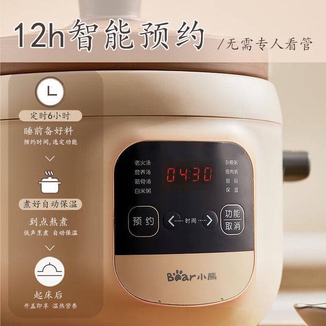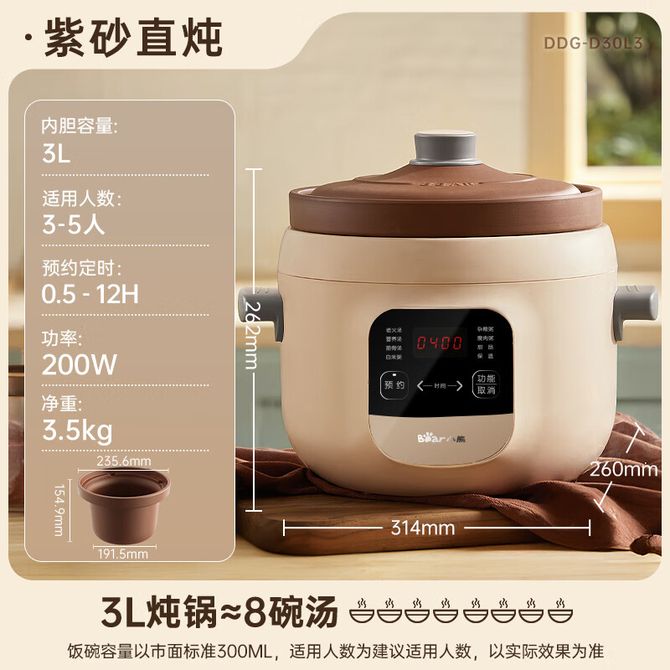 小熊/Bear 电炖锅 电砂锅 电炖盅 煲汤锅 炖汤锅 煮粥锅 紫砂锅 预约定时3-5人辅食燕窝3L电汤锅DDG-D30L3 天然紫砂直炖 兑换价格 6500 里程 会员卡别 终身白金卡 白金卡 金卡 银卡 普通卡 儿童卡 服务 由 北京掌一智科技有限公司 发货并提供售后 颜色: 其他 购买数量: 件 库存件 配送地址: 立即购买 加入购物车 成功添加到购物车 关闭 购物车共有 种商品 总金额为:
