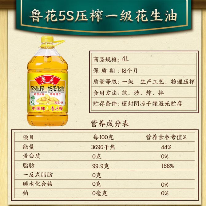 鲁花 5S压榨一级花生油4L