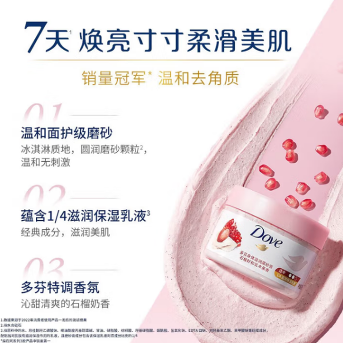 多芬 磨砂膏身体280g冰淇淋质地全身去角质 滋润保湿焕亮肌肤【主推】 【适用普通肤质】石榴清甜香280g 规格:280g*1罐;新旧包装随机发货 兑换价格 2400 里程 会员卡别 终身白金卡 白金卡 金卡 银卡 普通卡 儿童卡 服务 由 臻雀个护馆 发货并提供售后 化妆品容量: 其他容量 购买数量: 件 库存件 配送地址: 立即购买 加入购物车 成功添加到购物车 关闭 购物车共有 种商品 总金额为: 组合销售 产品介绍 产品规格 售后服务 产品咨询 发现好货 可悠然(KUYURA)沐浴露香氛美肌沐浴乳(恬静清香550ml) 3300 里程 舒肤佳/Safeguard 经典净护沐浴露纯白清香360g/720g/1000g 1100-2100 里程 蓝月亮 抑菌洗手液 500g*6瓶 芦荟滋润保湿 2900 里程 可悠然 沐浴露大黄瓶550ml(恬静清香)美肌香氛滋润保湿 男女通用香味持久沐浴乳 2100 里程 力士/LUX 沐浴露 恒久嫩肤沐浴乳400g/700g/900g/1000g 1100-1700 里程
