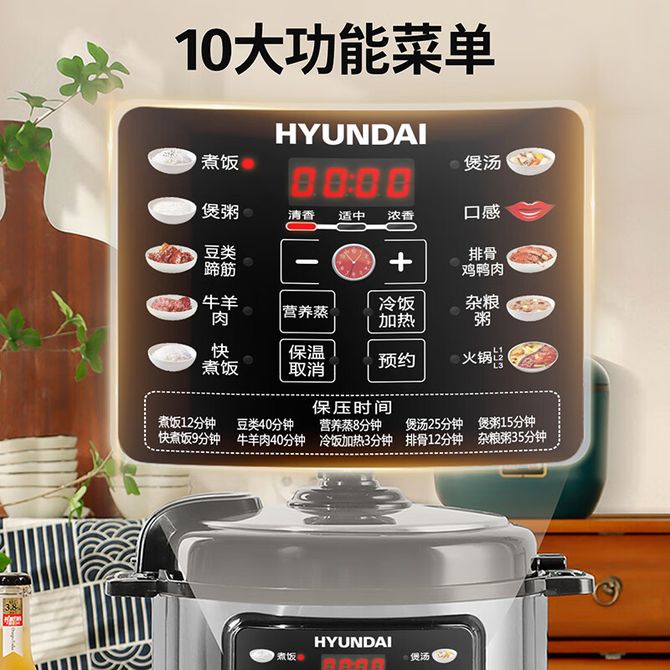 HYUNDAI 电压力锅 家用5L智能预约多功能不粘 银色 6L 单胆 电压力锅 家用5L智能预约多功能不粘双胆蒸煮煲汤易清洁高压锅电饭煲 兑换价格 30400 里程 会员卡别 终身白金卡 白金卡 金卡 银卡 普通卡 儿童卡 服务 由 纳华优选 发货并提供售后 颜色: 灰色 购买数量: 件 库存件 配送地址: 立即购买 加入购物车 成功添加到购物车 关闭 购物车共有 种商品 总金额为: 组合销售 产品介绍 产品规格 售后服务 产品咨询 发现好货 苏泊尔(SUPOR)电压力锅 6升大容量 智能触控 球釜双胆 开盖收汁 一键排压 SY-60YC8001Q 高压锅 16900 里程 苏泊尔(SUPOR) 5L电压力锅家用电高压锅双胆高压电饭锅煮饭智能预约 SY-50YC8186 11300 里程 美的/Midea 电压力锅 【一锅双胆】5L全自动家用智能预约 上蒸下煮 不粘双胆煲汤炖肉 YL50Q3-451 10900 里程 美的/Midea 电压力锅 【双胆】5升大容量电饭煲全自动智能饭锅多功能高压锅 24小时智能预约 MY-E523 10400 里程 九阳/Joyoung 电压力锅5L家用电饭锅压力煲电高压锅煮饭锅电饭锅电饭煲全自动智能预约 Y-50C31 11000 里程