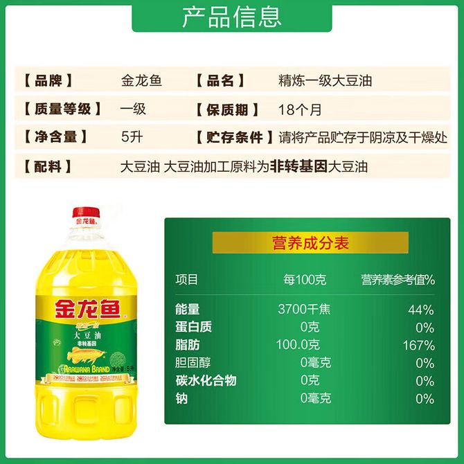 金龙鱼 食用油 非转基因浸出 精炼一级大豆油5L 5L*1桶 非转基因 精挑细选 工艺精炼 兑换价格 3900 里程 会员卡别 终身白金卡 白金卡 金卡 银卡 普通卡 儿童卡 服务 由 瑞昱生活馆 发货并提供售后 油品规格: 5L 购买数量: 件 库存件 配送地址: 立即购买 加入购物车 成功添加到购物车 关闭 购物车共有 种商品 总金额为: 组合销售 产品介绍 产品规格 售后服务 产品咨询 发现好货 长寿花 金胚玉米油食用油非转基因压榨一级 1.8L 2200 里程 珍佰粮菜籽油5L 5500 里程 福临门 一级大豆油900ML/瓶 优质家用食用油 1100 里程 福临门 家香味食用油 沂蒙土榨 花生仁油900ml 1600 里程 金龙鱼 浓香花生油5L 大桶装物理压榨一级厨房烹饪炒菜植物油粮油家庭食用油 浓香花生油食用油 5000 里程