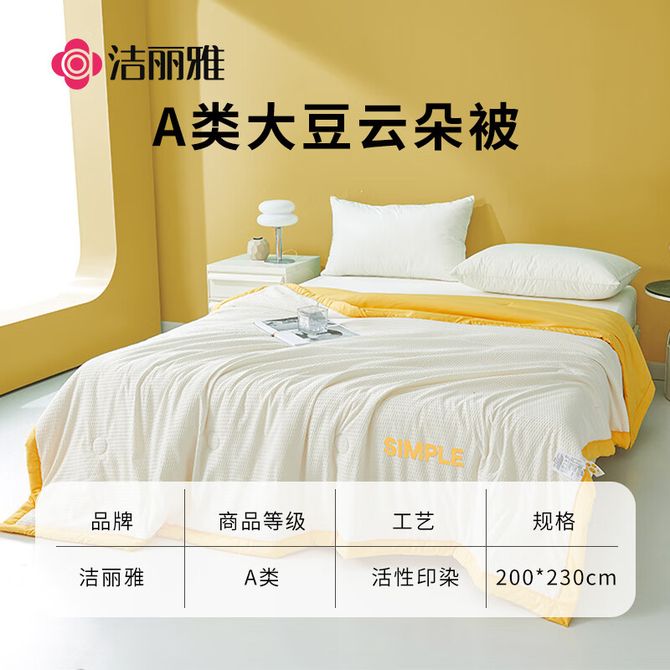 洁丽雅/Grace A类面料 10%大豆纤维 纤维被子 空调夏凉被200x230cm奶黄 CP2367 A类面料 10%大豆纤维 纤维被子 空调夏凉被200x230cm奶黄 CP2367 兑换价格 3400 里程 会员卡别 终身白金卡 白金卡 金卡 银卡 普通卡 儿童卡 服务 由 品质家纺 发货并提供售后 被、单尺寸: 200*230cm 颜色: 其他 购买数量: 件 库存件 配送地址: 立即购买 加入购物车 成功添加到购物车 关闭 购物车共有 种商品 总金额为: 组合销售 产品介绍 产品规格 售后服务 产品咨询 发现好货 洁丽雅(Grace)全棉夏凉被棉花被双人空调被 纯棉被子可机洗 薄被芯 洛洛繁花 150*200cm(Grace) 6100-7400 里程 洁帛 A类零压力抗菌防螨纤维春秋四季被 3500-3900 里程 北极绒(Bejirog) 泡泡纱大豆纤维四季被 细腻温润吸湿透气不闷不燥 BJRB314 8000 里程 洁丽雅/Grace 10%大豆纤维 纤维被子 空调夏凉被 (多规格可选)CP2262柠檬青 2500-3400 里程 京东京造 暖暖大白被 100%原生纤维A类磨毛厚实保暖被子冬季被芯 4斤-6.8斤 多尺寸可选 5000-7000 里程