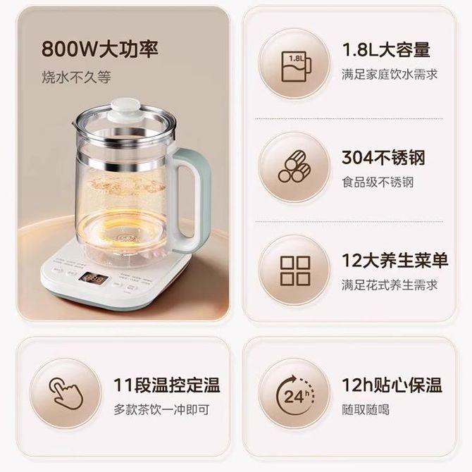 组合销售 产品介绍 产品规格 售后服务 产品咨询 发现好货 九阳/Joyoung 养生壶1.5L茶具电茶壶煮茶壶花茶壶玻璃煮茶器煎药壶中药锅药膳电水壶烧水壶 3900 里程 美的/Midea 养生壶 1.5L家用多功能小型全自动办公室烧水壶加厚玻璃煮茶热水壶 MK-YS15P201 4200 里程 美的/Midea 养生壶 1.5L家用养生壶全自动玻璃烧水壶24h预约烧水壶12小时防干烧保护智能恒温 MK-YS15P202 3500 里程 九阳/Joyoung 养生壶迷你玻璃花茶壶煮茶器 12大功能11档温度 电水壶热水壶烧水壶 1.5L DGD1506BQ 3900 里程 美的/Midea 养生壶 1.5L全自动电热水壶 24h预约12小时智能恒温 14大功能11档控温 花茶壶煮茶器MK-Y12Q 3500 里程
