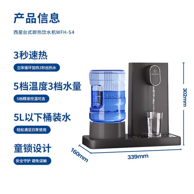 西屋/Westinghouse 即热式饮水机家用迷你小型台式桌面饮水机桶装水速热开水机自动上水办公室茶饮机 WFH-S4星空灰 支持5L以下桶装水,3S速热,随取随用;智能触控面板,实时数显;一键童锁,5档水温,3档水量,防干烧系统 兑换价格 24700 里程 会员卡别 终身白金卡 白金卡 金卡 银卡 普通卡 儿童卡 服务 由 弘济家电 发货并提供售后 颜色: 灰色 购买数量: 件 库存件 配送地址: 立即购买 加入购物车 成功添加到购物车 关闭 购物车共有 种商品 总金额为: 组合销售 产品介绍 产品规格 售后服务 产品咨询 发现好货 小熊/Bear 桶装水抽水器 电动抽水泵自动饮用水桶上水器 饮水机抽水器 折叠防尘 YSJD-06H5 2600 里程 小熊/Bear 抽水器桶装水 电动压水器自动吸水器矿泉水上水器饮水机大桶水取水器抽水泵316不锈钢 2200 里程 美菱/MELNG 家用茶吧机立式饮水机远程遥控智能触控大屏 MY-A06 16500 里程 小熊/Bear 抽水器 YSJ-D06H5 2400 里程 小熊/Bear 电动抽水器316不锈钢桶装水抽水泵电动压水器自动吸水器取水器矿泉水上水器饮水机大桶水 2200 里程