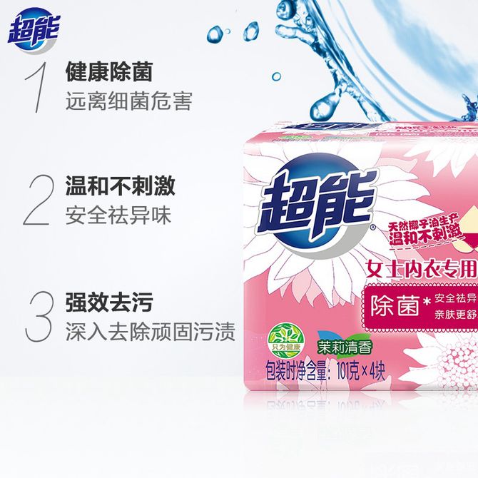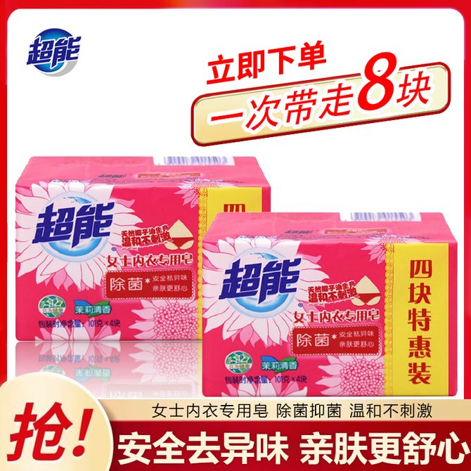 超能 女士内衣专用皂101g*4块肥皂去异味(2组装 到手8块)除菌祛异味 洁净易漂洗 除菌祛异味,柔软舒适,洁净易漂洗,茉莉清香(新旧包装随机发货) 兑换价格 1600 里程 会员卡别 终身白金卡 白金卡 金卡 银卡 普通卡 儿童卡 服务 由 京狮文化生活馆 发货并提供售后 净含量: 其他容量 清洁剂容量: 其他容量 购买数量: 件 库存件 配送地址: 立即购买 加入购物车 成功添加到购物车 关闭 购物车共有 种商品 总金额为: 组合销售 产品介绍 产品规格 售后服务 产品咨询 发现好货 蓝月亮 深层洁净洗衣液4斤 1kgx1瓶+500gx2补充装 薰衣草香 强效去渍 1500 里程 威露士/Walch La有氧洗洗衣液套装 4斤松木清香(瓶1L+袋500ml*2) 除菌除螨 1900 里程 蓝月亮 蓝月亮茉莉清香洁净洗衣液1kg*2 1400 里程 威露士 洗衣液除菌机洗手洗家用除螨去污1L*1瓶 1500 里程 蓝月亮 亮白增艳洗衣液2斤 1kg*1瓶 1100 里程