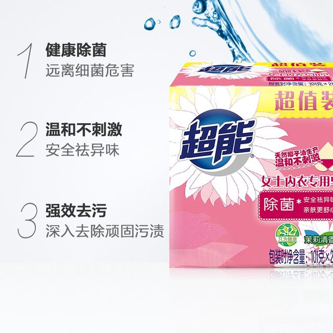 超能 女士内衣皂茉莉清香祛血渍祛异味透明皂-内衣专用皂101g*2块*3组 有效除菌,易漂易洗,茉莉清香 兑换价格 1300 里程 会员卡别 终身白金卡 白金卡 金卡 银卡 普通卡 儿童卡 服务 由 京狮文化生活馆 发货并提供售后 净含量: 其他容量 清洁剂容量: 其他容量 购买数量: 件 库存件 配送地址: 立即购买 加入购物车 成功添加到购物车 关闭 购物车共有 种商品 总金额为: 组合销售 产品介绍 产品规格 售后服务 产品咨询 发现好货 蓝月亮 深层洁净洗衣液4斤 1kgx1瓶+500gx2补充装 薰衣草香 强效去渍 1500 里程 威露士/Walch La有氧洗洗衣液套装 4斤松木清香(瓶1L+袋500ml*2) 除菌除螨 1900 里程 蓝月亮 蓝月亮茉莉清香洁净洗衣液1kg*2 1400 里程 威露士 洗衣液除菌机洗手洗家用除螨去污1L*1瓶 1500 里程 蓝月亮 亮白增艳洗衣液2斤 1kg*1瓶 1100 里程
