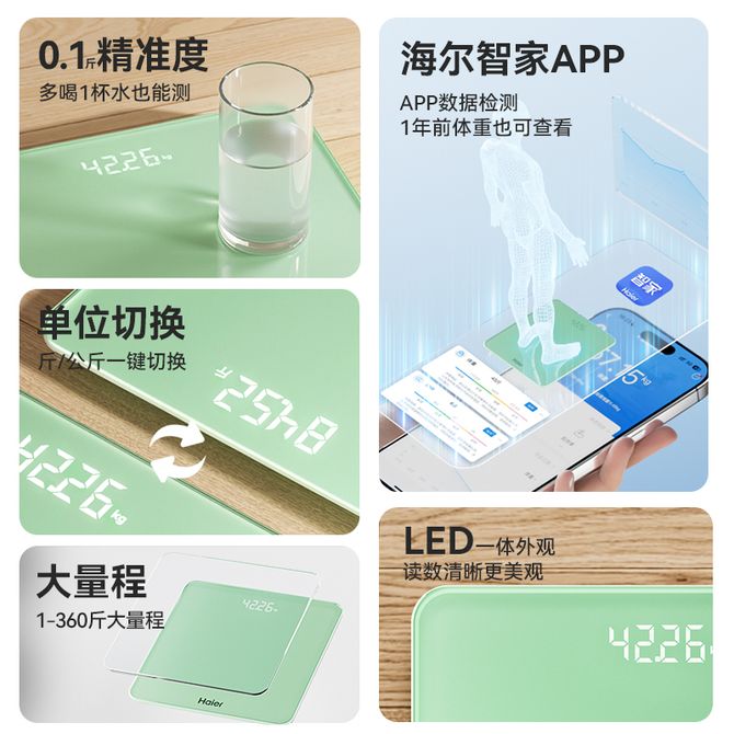 海尔/Haier 电子称健康秤智能体重秤家用宿舍办公室学生便携体重检测体重减肥专用 斤/公斤切换 360斤称重 LED一体显示 兑换价格 2600 里程 会员卡别 终身白金卡 白金卡 金卡 银卡 普通卡 儿童卡 服务 由 广西自贸区京通桂达科技发展有限公司 发货并提供售后 颜色: 其他 购买数量: 件 库存件 配送地址: 立即购买 加入购物车 成功添加到购物车 关闭 购物车共有 种商品 总金额为: