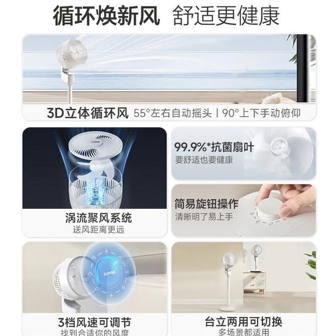 苏泊尔/Supor 空气循环扇 【台立两用】立体循环风 3档风速可调节 简易旋钮操控 FC-104B-18 55°左右自动摇头;190°上下手动俯仰;99.9%*抗菌扇叶; 兑换价格 10900 里程 会员卡别 终身白金卡 白金卡 金卡 银卡 普通卡 儿童卡 服务 由 小枫叶专营店 发货并提供售后 颜色: 白色 购买数量: 件 库存件 配送地址: 立即购买 加入购物车 成功添加到购物车 关闭 购物车共有 种商品 总金额为: