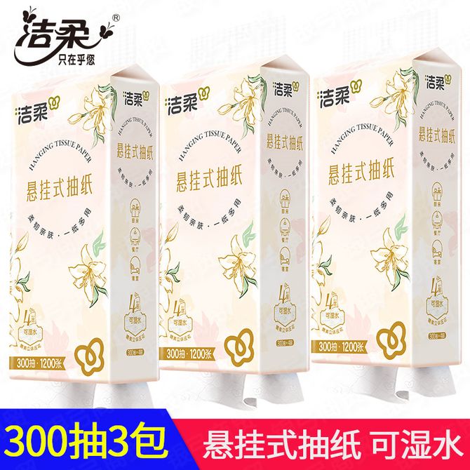 洁柔 300抽3提悬挂式抽纸 便利抽纸、擦手纸巾 可湿水纸巾 一般48小时内发出,节假日发货可能会有延迟,部分商品厂家可能进行包装升级,新旧包装随机发,还请多多谅解 兑换价格 1300 里程 会员卡别 终身白金卡 白金卡 金卡 银卡 普通卡 儿童卡 服务 由 好时光家居专营店 发货并提供售后 包装数量: 3提 购买数量: 件 库存件 配送地址: 立即购买 加入购物车 成功添加到购物车 关闭 购物车共有 种商品 总金额为: 组合销售 产品介绍 产品规格 售后服务 产品咨询 发现好货 维达卷纸 卫生纸实惠装厕纸家用厕所纸巾手纸整箱批有芯大卷家庭装 1200-2300 里程 维达 Vinda 卷纸 140g/卷*10卷 蓝色经典3层卫生纸 1300 里程 心相印抽纸 茶语丝享系列 量贩家庭装 3层*100抽*4包(茶香 压花) 1100 里程 心相印 经典系列 二层面巾纸 180抽*6包*1提 1100 里程 维达Vinda 超韧系列抽纸(3层*130抽*6包) 原生木浆卫生餐巾纸婴儿面巾纸 6包优惠装 1100 里程