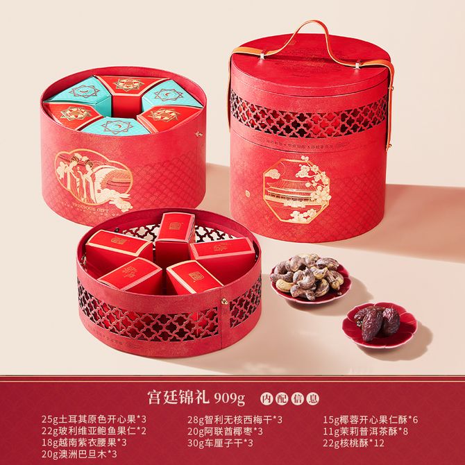 配置:宫廷锦礼礼盒909g,内含4种坚果、3种果干、3款糕点