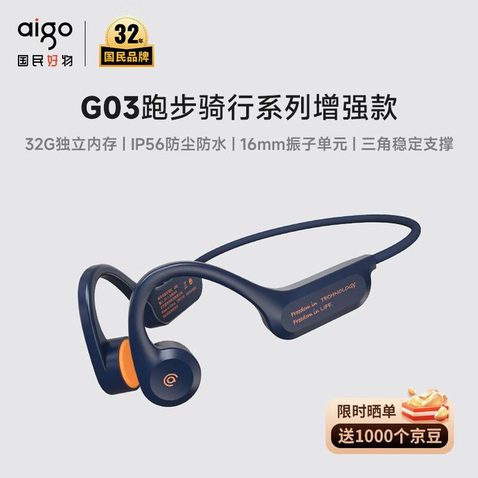 爱国者(aigo) 骨传导蓝牙运动耳机 G03【32G内存-藏蓝色】 IP56级防尘防水 开放式无线MP3 骑行跑步挂耳式 长续航 IP56级防尘防水 开放式无线MP3 骑行跑步挂耳式 长续航 兑换价格 8300 里程 会员卡别 终身白金卡 白金卡 金卡 银卡 普通卡 儿童卡 服务 由 华睿博望 发货并提供售后 颜色: 蓝色 购买数量: 件 库存件 配送地址: 立即购买 加入购物车 成功添加到购物车 关闭 购物车共有 种商品 总金额为: 组合销售 产品介绍 产品规格 售后服务 产品咨询 发现好货 雷摄 运动蓝牙耳机无线跑步超长续航待机半入耳降噪高端健身2024新款 BT-03半入耳 1400 里程 魔声 (MONSTER)Open Ear AC600骨传导概念蓝牙耳机开放式无线夹耳式不入耳式耳夹式运动通话降噪手机通用 3700 里程 飞利浦(PHILIPS)真无线蓝牙耳机跑步运动耳机防水防汗TAT1168 8700 里程 漫步者EDIFIER 真无线蓝牙耳机Zero Air月白 通话降噪半入耳低延游戏手机音乐耳塞 5200 里程 OKSJ 无线蓝牙耳机-i24 4400 里程
