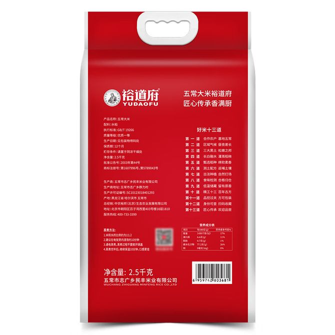 裕道府 五常大米2.5kg 米掌柜系列 06.01.317 下单规格:1袋=2.5kg 兑换价格 2100 里程 会员卡别 终身白金卡 白金卡 金卡 银卡 普通卡 儿童卡 服务 由 会当食品专营店 发货并提供售后 规格: 袋装 购买数量: 件 库存件 配送地址: 立即购买 加入购物车 成功添加到购物车 关闭 购物车共有 种商品 总金额为: 组合销售 产品介绍 产品规格 售后服务 产品咨询 发现好货 金熊 泰国茉莉 香米 1kg 泰国原料进口 1300 里程 十月稻田当季新米辽河长粒香大米 5kg 东北大米 香米 粳米 十斤 2100 里程 源头说 五常有机稻花香新米 东北大米 2.5kg(双重防伪认证) 4200 里程 十月稻田 长粒香大米2.5kg 东北大米5斤 东北香米 1300 里程 裕道府东北大米好味稻香米 5kg 2000 里程