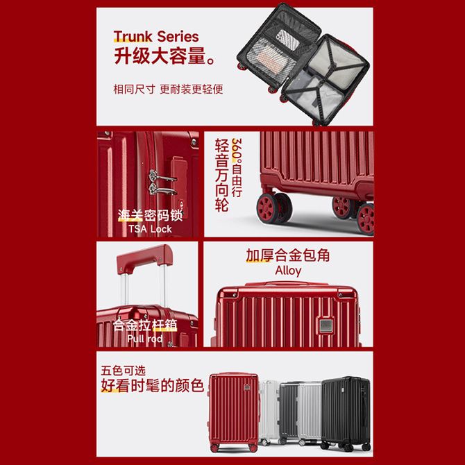 皮尔卡丹/Pierre Cardin 20寸红色行李箱结婚陪嫁箱子女方婚庆压婚礼用密码箱新娘嫁妆箱 【有侧提手】【有侧提手】【顺丰配送】【顺丰配送】 兑换价格 7400 里程 会员卡别 终身白金卡 白金卡 金卡 银卡 普通卡 儿童卡 商品已下架 1. 请联系卖家咨询 2. 逛逛琅华箱包选择其他商品 组合销售 产品介绍 产品规格 售后服务 产品咨询 发现好货 星迪威克-万向轮行李箱登机箱传统美学男女通用-750复古包角-20寸 5600 里程 恒源祥20寸网红拉杆箱行李箱拉链万向轮登机箱静音学生旅游潮流商务海关密码锁旅行箱HYX-2007 8000 里程 TYMON拉杆箱男女商务旅行登机箱TSA万向轮行李箱20英寸密码箱 黑色 幽兰丽影 12900 里程 皮尔卡丹/Pierre Cardin 20英寸简约时尚行李箱拉杆箱登机箱旅行箱密码箱子男女通用 5700 里程 旅行之家(Travelhouse)T1879 20寸全铝拉杆箱 轻盈耐磨万向轮登机箱行李箱 28900 里程