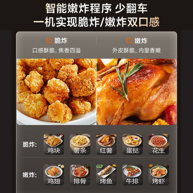 组合销售 产品介绍 产品规格 售后服务 产品咨询 发现好货 苏泊尔(SUPOR)空气炸锅 家用多功能4.2L大容量 烤箱薯条机 无油烟电炸锅 大功率 无油低脂煎炸锅KJ42D811 6500 里程 苏泊尔(SUPOR)空气炸锅家用3L大容量电炸锅 蒸汽嫩炸多功能无油烟煎炸薯条机烤箱KD30DQ815 21700 里程 美的/Midea 空气炸锅 家用5升可视炸锅金属内腔体微蒸汽多功能智能双旋控温电炸锅 KZE5089 10900 里程 美的/Midea 空气炸锅 可视 不用翻面 金属内腔 蒸汽嫩炸 三档烘烤风力 5L KZC5089 10700 里程 小熊/Bear 空气炸锅 4D漩烤不用翻面 全自动 5L实用大容量 可视 蒸汽嫩炸 控油脱脂 炸烤箱一体机 9100 里程