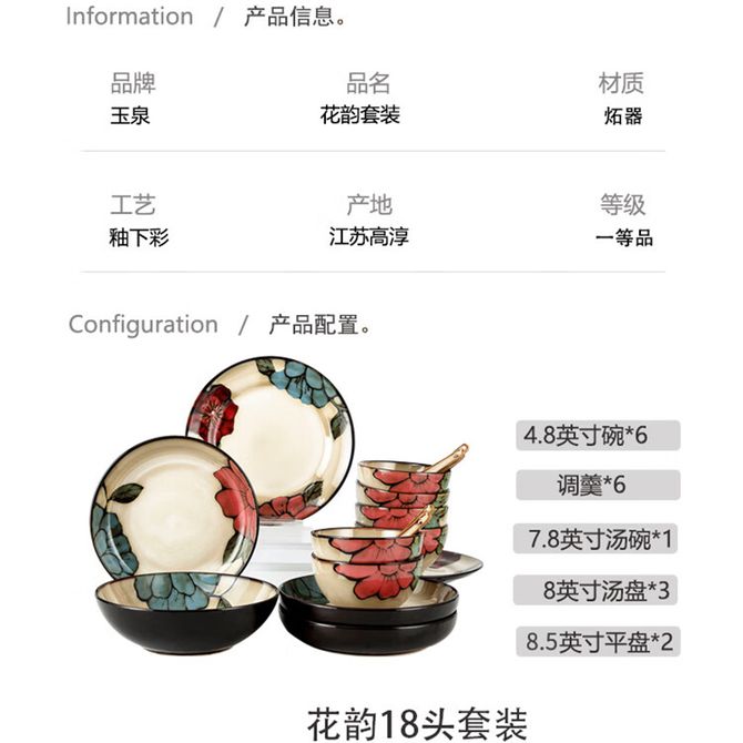 玉泉 花韵系列18头餐具 中式田园餐具套装碗碟碗 高温烧制 釉下彩工艺 18头套装 可放入微波炉/烤箱等 兑换价格 10900 里程 会员卡别 终身白金卡 白金卡 金卡 银卡 普通卡 儿童卡 服务 由 翻羽优生活 发货并提供售后 颜色: 其他 购买数量: 件 库存件 配送地址: 立即购买 加入购物车 成功添加到购物车 关闭 购物车共有 种商品 总金额为: 组合销售 产品介绍 产品规格 售后服务 产品咨询 发现好货 Homy-骨质瓷莉婉7寸面碗1件装 2200 里程 青苹果 欧式家用玻璃茶色五件套 碗盘碟套装 耐热泡面碗餐具 玻璃煲+深盘2只+双耳碗2只 1600 里程 易铂yispot家用430食品级不锈钢水果叉甜品勺套装10支咖啡勺长柄YP-8068 1500 里程 拜格(Bayco) 味斗盆蔬果盆5件套 标准款20C-26CM BX6041 2200 里程 康巴赫(KBH) 鸡翅木筷家用实木无漆无蜡防滑耐高温套装10双装筷子 BH-JCM25A1 1100 里程