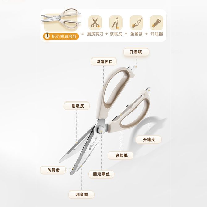 小熊 厨房多功能剪刀 家用不锈钢强力剪刀 剪鸡骨单把剪刀 3cr13精炼钢 一剪多用 厨房多功能剪刀 兑换价格 1300 里程 会员卡别 终身白金卡 白金卡 金卡 银卡 普通卡 儿童卡 服务 由 广西自贸区贝佳网络科技有限公司 发货并提供售后 颜色: 其他 购买数量: 件 库存件 配送地址: 立即购买 加入购物车 成功添加到购物车 关闭 购物车共有 种商品 总金额为: 组合销售 产品介绍 产品规格 售后服务 产品咨询 发现好货 拜格(Bayco) 不锈钢白色刀具刀座套装6件套 BD30058 2600 里程 张小泉 厨房多功能剪刀 可拆卸剪鱼刮鱼鳞剖鸡J20110100 1700 里程 拜格BAYCO 家用剪刀3件套家庭厨房剪居家手工剪办公学生剪 ZH2851 1100 里程 菲仕乐Fissler 多用剪刀 EM-FS-JD002 2000 里程 拜格 剪刀三件套家用厨房不锈钢多功能家用剪肉鸡骨剪子TZ28203 1100 里程