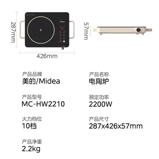 美的/Midea 电磁炉 电陶炉 2200W双环大功率烧水炒菜 HW2210 不挑锅具材质;200mm发热盘;双环聚能加热;3小时定时; 兑换价格 7800 里程 会员卡别 终身白金卡 白金卡 金卡 银卡 普通卡 儿童卡 服务 由 小枫叶专营店 发货并提供售后 颜色: 杏色 购买数量: 件 库存件 配送地址: 立即购买 加入购物车 成功添加到购物车 关闭 购物车共有 种商品 总金额为: