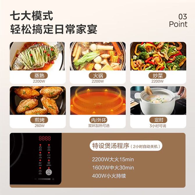 美的/Midea 电磁炉 电陶炉 2200W双环大功率烧水炒菜 HW2210 不挑锅具材质;200mm发热盘;双环聚能加热;3小时定时; 兑换价格 7800 里程 会员卡别 终身白金卡 白金卡 金卡 银卡 普通卡 儿童卡 服务 由 小枫叶专营店 发货并提供售后 颜色: 杏色 购买数量: 件 库存件 配送地址: 立即购买 加入购物车 成功添加到购物车 关闭 购物车共有 种商品 总金额为: 组合销售 产品介绍 产品规格 售后服务 产品咨询 发现好货 美的/Midea 电磁炉2100W大功率家用触控按键耐用面板八档火力定时功能防水电磁灶火锅炉C21-RT21E01 2100W大功率 6500 里程 美的(Midea) 电磁炉 家用大火力电池炉电磁灶 RT21E0105 7000 里程 美的(Midea)电磁炉商用2200W大功率配锅套装家用电磁灶触控MC-CL22Q1-405J 7800 里程 小米 米家电磁炉青春版 2100W大功率 9档变频控温 DCL002CM 9600 里程 美的/Midea 电磁炉 家用大功率 4D防水面板 2200W大火力炒菜火锅不粘炒锅一体小型电磁灶 5700 里程