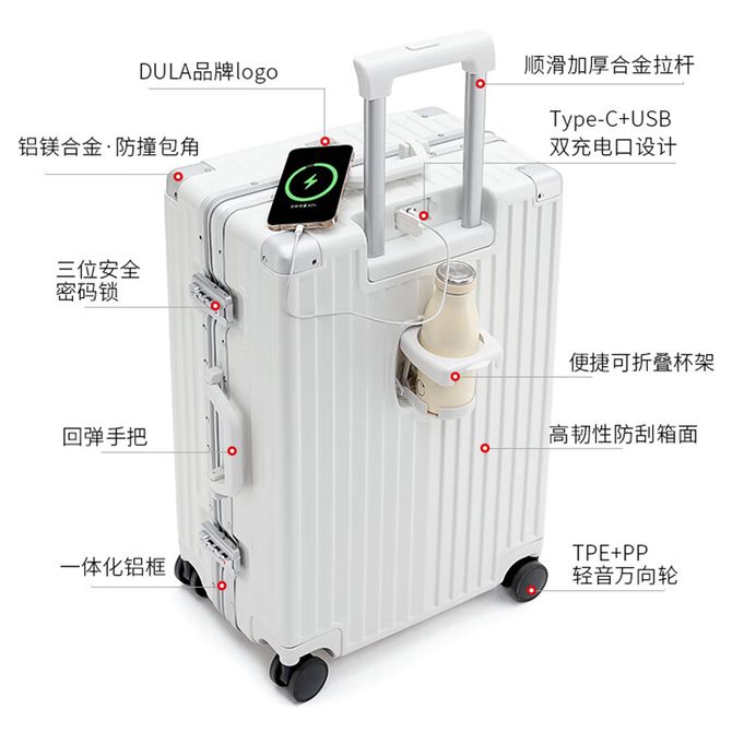 DULA 铝框行李箱 多功能拉杆箱杯架 小型旅行密码箱充电登机皮箱子 复合防刮箱面登机箱 20英寸 干湿分离内装 湿衣服直接收纳 轻松出行 兑换价格 15600 里程 会员卡别 终身白金卡 白金卡 金卡 银卡 普通卡 儿童卡 服务 由 睿节箱包 发货并提供售后 颜色: 白色 黑色 灰色 粉色 购买数量: 件 库存件 配送地址: 立即购买 加入购物车 成功添加到购物车 关闭 购物车共有 种商品 总金额为: