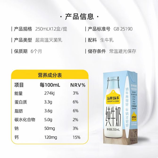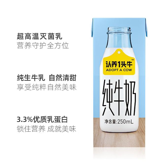 认养一头牛ADOPT A COW 、全脂纯牛奶250ml*12盒 两提装 优质乳蛋白全脂纯牛奶 兑换价格 3500 里程 会员卡别 终身白金卡 白金卡 金卡 银卡 普通卡 儿童卡 服务 由 凯赋甄选 发货并提供售后 规格: 组合 购买数量: 件 库存件 配送地址: 立即购买 加入购物车 成功添加到购物车 关闭 购物车共有 种商品 总金额为: 组合销售 产品介绍 产品规格 售后服务 产品咨询 发现好货 蒙牛 特仑苏纯牛奶苗条装250ml×12盒 2900 里程 三元 经典小方白全脂纯牛奶250ml*24盒牛奶 整箱 3400 里程 伊利金典纯牛奶250ml*12盒整箱 2200 里程 三元 极致 全脂纯牛奶250ml*12盒 优质乳蛋白 恪守天然亲和 2900 里程 伊利 金典纯牛奶整箱 250ml*12盒 原生高钙3.6g乳蛋白 2000 里程