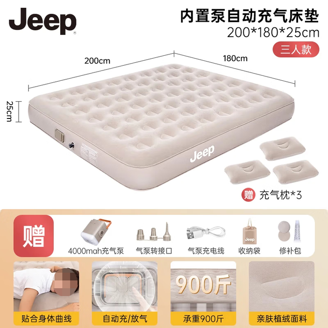 Jeep 户外露营全自动充气垫充气床 三人床200*180*25cm 卡其 三人床:200*180*25cm 收纳:40*15.5*31cm 兑换价格 11400 里程 会员卡别 终身白金卡 白金卡 金卡 银卡 普通卡 儿童卡 服务 由 至恩户外运动专营店 发货并提供售后 颜色: 卡其色 购买数量: 件 库存件 配送地址: 立即购买 加入购物车 成功添加到购物车 关闭 购物车共有 种商品 总金额为: 组合销售 产品介绍 产品规格 售后服务 产品咨询 发现好货 创悦 防潮垫 户外便携加厚绒面双层野餐垫 1.5*2米 CY-5826小树叶 2200 里程 徽羚羊 户外防水牛津布2*2M野餐垫防潮垫帐篷内垫子地垫儿童爬爬垫 1500-2700 里程 创悦 铝膜防潮垫 户外便携式野餐垫 三人帐篷用 2*2米 CY-5823 1700 里程 尙烤佳 野营垫便携防潮垫 星辰牛津布野餐垫 3500 里程 创悦 铝膜防潮垫 户外便携式野餐垫 两人帐篷用 1.5*2米 CY-5822 1300 里程