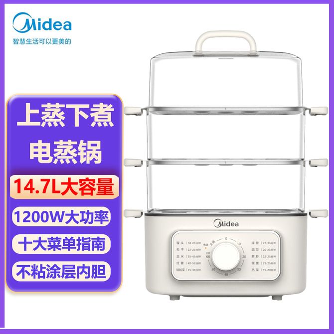 美的/Midea 电蒸锅14.7L大容量多层电热锅多功能家用电锅蒸菜蒸包子锅蒸螃蟹热菜电煮锅上蒸下煮 上蒸下煮电蒸锅 14.7L大容量 1200W大功率 十大菜单指南 不粘涂层内胆 兑换价格 8300 里程 会员卡别 终身白金卡 白金卡 金卡 银卡 普通卡 儿童卡 服务 由 广西自贸区京通桂达科技发展有限公司 发货并提供售后 颜色: 其他 购买数量: 件 库存件 配送地址: 立即购买 加入购物车 成功添加到购物车 关闭 购物车共有 种商品 总金额为: 组合销售 产品介绍 产品规格 售后服务 产品咨询 发现好货 苏泊尔(SUPOR)空气炸锅 家用多功能4.2L大容量 烤箱薯条机 无油烟电炸锅 大功率 无油低脂煎炸锅KJ42D811 6500 里程 苏泊尔(SUPOR)空气炸锅家用3L大容量电炸锅 蒸汽嫩炸多功能无油烟煎炸薯条机烤箱KD30DQ815 21700 里程 美的/Midea 空气炸锅 家用5升可视炸锅金属内腔体微蒸汽多功能智能双旋控温电炸锅 KZE5089 10900 里程 美的/Midea 空气炸锅 可视 不用翻面 金属内腔 蒸汽嫩炸 三档烘烤风力 5L KZC5089 10700 里程 小熊/Bear 空气炸锅 4D漩烤不用翻面 全自动 5L实用大容量 可视 蒸汽嫩炸 控油脱脂 炸烤箱一体机 9100 里程