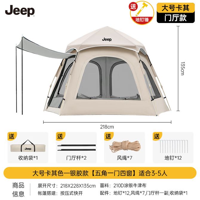Jeep 五角一门四窗银胶自动速开帐篷 大号 218*228*135cm 一门四窗、大号 218*228*135cm 兑换价格 11700 里程 会员卡别 终身白金卡 白金卡 金卡 银卡 普通卡 儿童卡 服务 由 至恩户外运动专营店 发货并提供售后 颜色: 卡其色 购买数量: 件 库存件 配送地址: 立即购买 加入购物车 成功添加到购物车 关闭 购物车共有 种商品 总金额为: 组合销售 产品介绍 产品规格 售后服务 产品咨询 发现好货 北山狼/BSWolf 户外月亮椅露营折叠椅便携式野餐沙滩休闲躺椅 卡其色-成人款 2600 里程 徽羚羊 帐篷防雨布天幕户外遮阳超轻便携大凉棚野露营防雨遮阳棚 300*295CM 5000 里程 徽羚羊 花间小记 双人200*150户外出游露营旅游便携透气加厚帆布吊椅蓝绿/红黄吊床 1900 里程 创悦(CREAJOY)便携式帐篷 2-3人室内外露营遮阳帐篷 200*150*115cm CY-5800蓝色 5300 里程 探险者(TAN XIAN ZHE) 帐篷 户外便携式折叠露营装备全自动帐篷 3-4人银胶速开帐篷 (200*145*120cm) 8500 里程