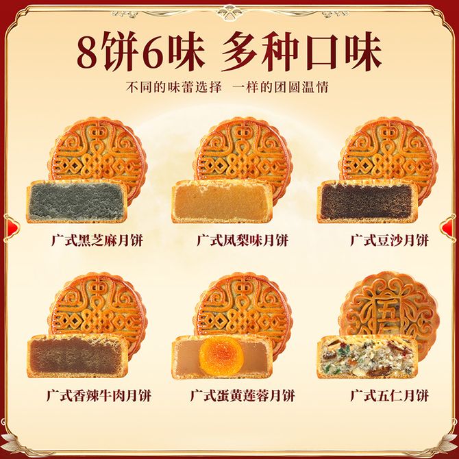 五仁味月饼 100g 豆沙味月饼 100g 凤梨味月饼 80g 黑芝麻味月饼 80g 香辣牛肉味月饼 80g 莲蓉蛋黄味月饼 80g