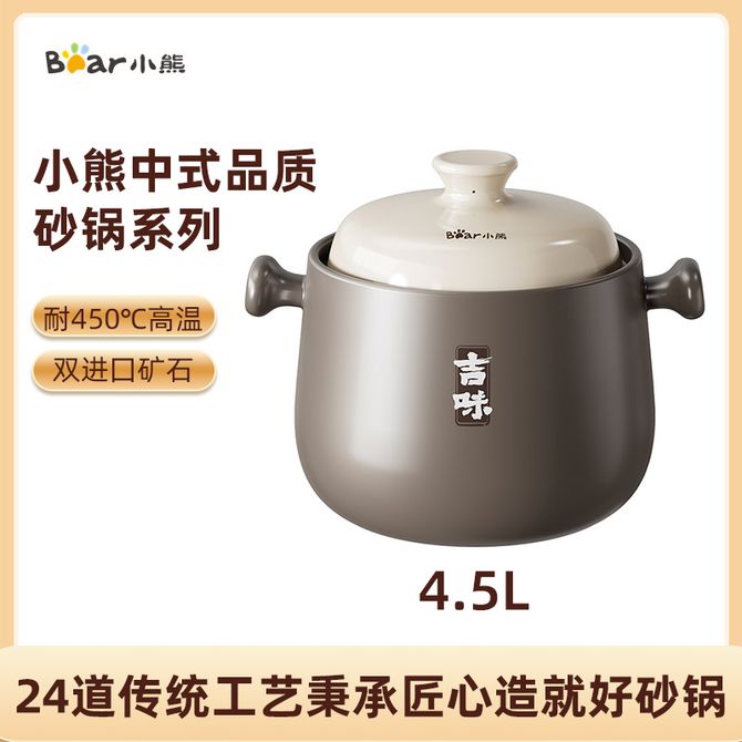 小熊 家用煲汤锅4.5L容量 耐高温不开裂双进口矿石加厚锅身炖汤锅 (详情图片共用-4.5L)双进口矿石 专煲专用 耐450°C高温 0重金属析出 微压焖炖 加厚锅身 光滑釉面 兑换价格 6500 里程 会员卡别 终身白金卡 白金卡 金卡 银卡 普通卡 儿童卡 服务 由 广西桂雅文化传媒有限公司 发货并提供售后 颜色: 其他 购买数量: 件 库存件 配送地址: 立即购买 加入购物车 成功添加到购物车 关闭 购物车共有 种商品 总金额为: 组合销售 产品介绍 产品规格 售后服务 产品咨询 发现好货 荣事达/Royalstar 煲锅 砂锅煲汤熬药煮粥焖饭砂锅陶瓷炖汤沙锅家用养生汤锅瓦煲瓦罐4.6L 3900 里程 炊大皇/Cookerking 砂锅5L耐高温陶瓷煲多用炖锅汤锅家用养生煲陶瓷锅明火煤燃气灶专用TCXW5002 4400 里程 陶煲王(TAOBAOWANG) 日式砂锅煲1.5L汤锅陶瓷沙锅耐高温PB-2107K 3600 里程 苏泊尔(SUPOR) 砂锅煲汤锅炖锅4.5L养生煲耐高温不开裂陶瓷煲EB45MAT01 6000 里程 炊大皇/Cookerking 砂锅 6L耐高温陶瓷煲多用炖锅汤锅 家用养生煲陶瓷锅 明火煤燃气灶专用TCXW6003 4800 里程