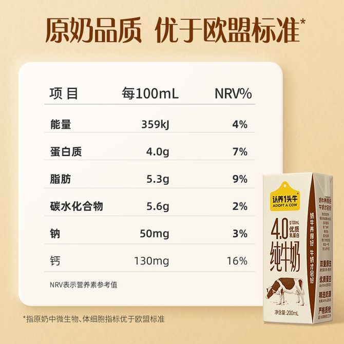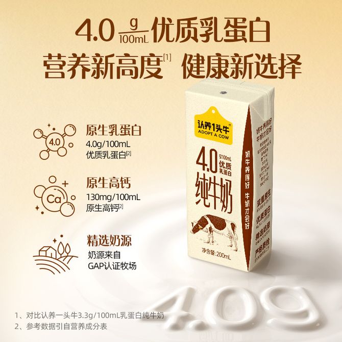 认养一头牛ADOPT A COW 4.0g蛋白纯牛奶200ml*18盒 4.0g/100ml 优质乳蛋白 兑换价格 3000 里程 会员卡别 终身白金卡 白金卡 金卡 银卡 普通卡 儿童卡 服务 由 凯赋甄选 发货并提供售后 规格: 礼盒 购买数量: 件 库存件 配送地址: 立即购买 加入购物车 成功添加到购物车 关闭 购物车共有 种商品 总金额为: 组合销售 产品介绍 产品规格 售后服务 产品咨询 发现好货 蒙牛 特仑苏纯牛奶苗条装250ml×12盒 2900 里程 三元 经典小方白全脂纯牛奶250ml*24盒牛奶 整箱 3400 里程 伊利金典纯牛奶250ml*12盒整箱 2200 里程 伊利 金典纯牛奶整箱 250ml*12盒 3.6g乳蛋白 原生高钙 礼盒装 1800 里程 特仑苏 新日期纯牛奶250ml*12盒 3.6g乳蛋白 礼盒装 京东/顺丰发货 2400 里程