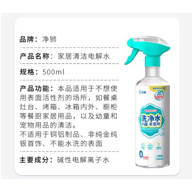 净狮/clealion 电解水清洁剂消毒杀菌厨房油污清洁剂冰箱微波炉烤箱去油 【1瓶加替换装】 净狮家居清洁电解水【1瓶正装+1瓶替换装】 兑换价格 2100 里程 会员卡别 终身白金卡 白金卡 金卡 银卡 普通卡 儿童卡 服务 由 单正个护专营店 发货并提供售后 清洁剂容量: 1L 净含量: 1L 购买数量: 件 库存件 配送地址: 立即购买 加入购物车 成功添加到购物车 关闭 购物车共有 种商品 总金额为: 组合销售 产品介绍 产品规格 售后服务 产品咨询 发现好货 超能 西柚祛腥洗洁精1kg*2瓶 家用果蔬清洗剂 1200 里程 滴露/Dettol 滋润倍护洗手液500g*2两瓶装 1900 里程 滴露/Dettol 泡沫抑菌洗手液青柠香型250ml 1300 里程 蓝月亮 卫诺沁香花园香氛洁厕液 500g×6瓶 4100 里程 威露士 洗手液 倍护滋润250ml *2瓶 深入洁净有效抑菌温和滋润清洁双手 1100 里程