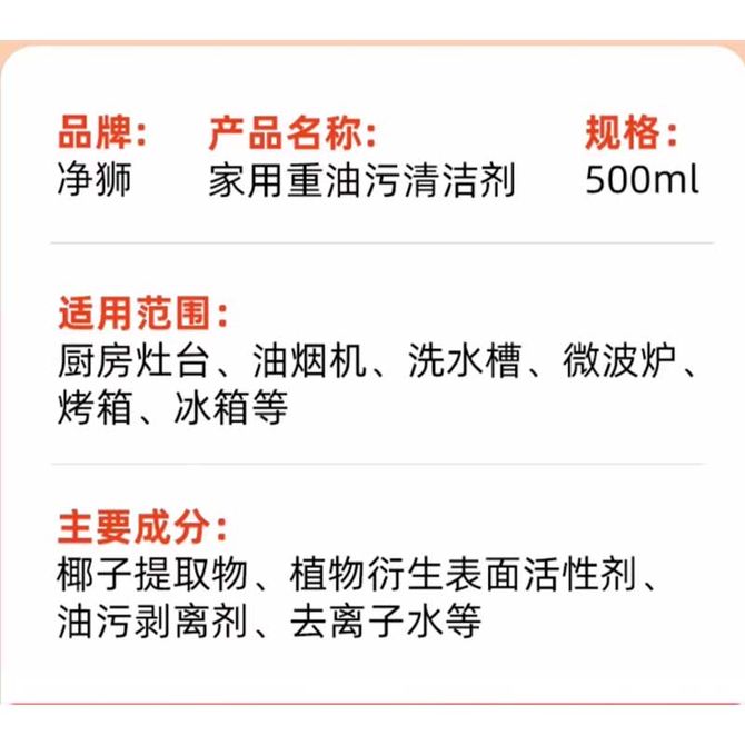 净狮/clealion 厨房油污清洁剂油烟机清洗剂除重油污油烟净污泡沫清洗剂 家用多功能重油污清洁剂2瓶装 净狮 家用重油污清洁剂2瓶装 兑换价格 2900 里程 会员卡别 终身白金卡 白金卡 金卡 银卡 普通卡 儿童卡 服务 由 单正个护专营店 发货并提供售后 清洁剂容量: 1L 净含量: 1L 购买数量: 件 库存件 配送地址: 立即购买 加入购物车 成功添加到购物车 关闭 购物车共有 种商品 总金额为: 组合销售 产品介绍 产品规格 售后服务 产品咨询 发现好货 超能 西柚祛腥洗洁精1kg*2瓶 家用果蔬清洗剂 1200 里程 滴露/Dettol 滋润倍护洗手液500g*2两瓶装 1900 里程 滴露/Dettol 泡沫抑菌洗手液青柠香型250ml 1300 里程 蓝月亮 卫诺沁香花园香氛洁厕液 500g×6瓶 4100 里程 威露士 洗手液 倍护滋润250ml *2瓶 深入洁净有效抑菌温和滋润清洁双手 1100 里程