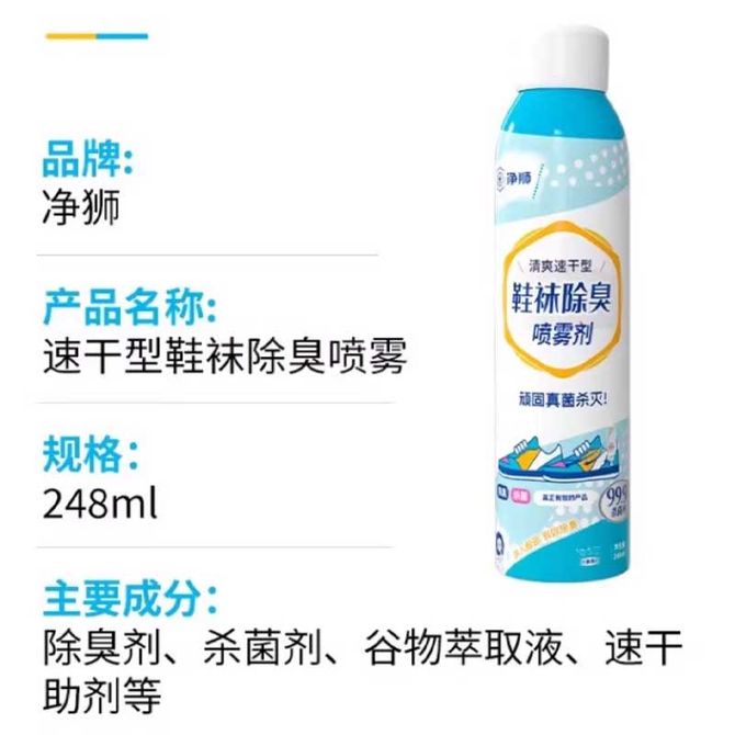 净狮/clealion 鞋子除臭杀菌喷雾鞋袜除臭剂鞋柜去异味脚臭球鞋防臭除菌鞋袜喷剂 速干型鞋袜除菌除臭喷雾2瓶 速干型鞋袜除臭喷雾2瓶装 兑换价格 3100 里程 会员卡别 终身白金卡 白金卡 金卡 银卡 普通卡 儿童卡 服务 由 单正个护专营店 发货并提供售后 清洁剂容量: 其他容量 净含量: 其他容量 购买数量: 件 库存件 配送地址: 立即购买 加入购物车 成功添加到购物车 关闭 购物车共有 种商品 总金额为: 组合销售 产品介绍 产品规格 售后服务 产品咨询 发现好货 舒肤佳抑菌洗手液 纯白清香420g+柠檬420g(新老包装随机发货) 3400 里程 滴露/Dettol 泡沫抑菌洗手液青柠香型250ml 1300 里程 蓝月亮 卫诺沁香花园香氛洁厕液 500g×6瓶 4100 里程 滴露/Dettol 消毒液消毒水1.8L衣物除菌液家居宠物环境地板杀菌除螨 非84酒精 3110246 4100 里程 立白 生姜洗洁精 2.5kg 除腥祛味 1200 里程