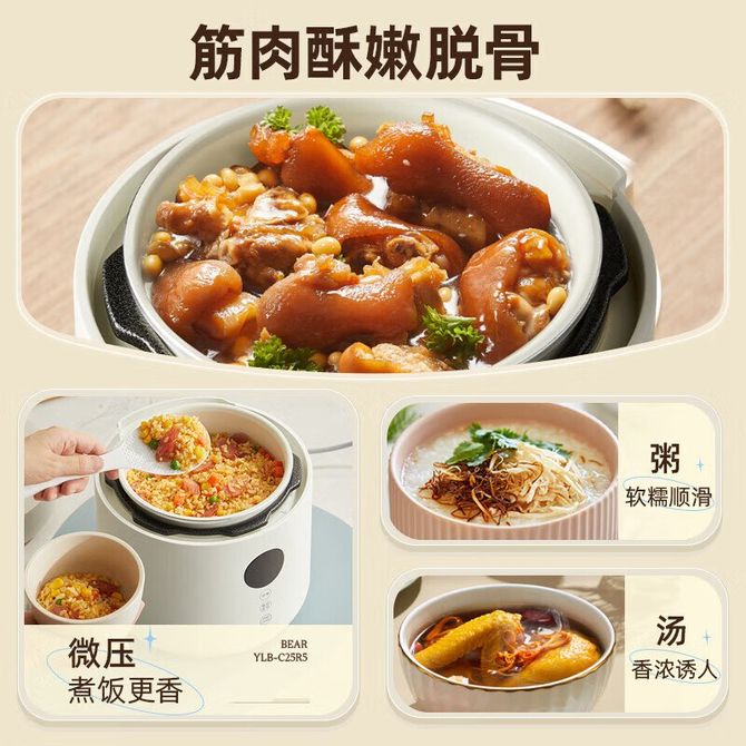 小熊/Bear 电压力锅2.5L精巧容量6大智能菜单24h预约多重安全防护耐磨不易粘一键排气泄压保护家庭电压力锅(单胆) 智能控压 快速导热 分体锅盖 微电脑触控 兑换价格 11700 里程 会员卡别 终身白金卡 白金卡 金卡 银卡 普通卡 儿童卡 服务 由 北京致诚博雅贸易有限公司 发货并提供售后 颜色: 其他 购买数量: 件 库存件 配送地址: 立即购买 加入购物车 成功添加到购物车 关闭 购物车共有 种商品 总金额为: 组合销售 产品介绍 产品规格 售后服务 产品咨询 发现好货 苏泊尔(SUPOR)电压力锅 6升大容量 智能触控 球釜双胆 开盖收汁 一键排压 SY-60YC8001Q 高压锅 16900 里程 美的/Midea 电压力锅家用5L大容量多功能高压锅双胆一键收汁智能预约不粘电高压锅电饭锅煮粥煲汤锅 一锅双胆【一键收汁入味】 YL50M1-702 10600 里程 苏泊尔(SUPOR) 5L电压力锅家用电高压锅双胆高压电饭锅煮饭智能预约 SY-50YC8186 11300 里程 美的/Midea 电压力锅 【一锅双胆】5L全自动家用智能预约 上蒸下煮 不粘双胆煲汤炖肉 YL50Q3-451 10900 里程 美的/Midea 电压力锅 高压锅家用电压力煲智能预约电饭煲大容量多功能定时预约电饭煲3-8人单胆旋钮款4L MY-E4809 8700 里程